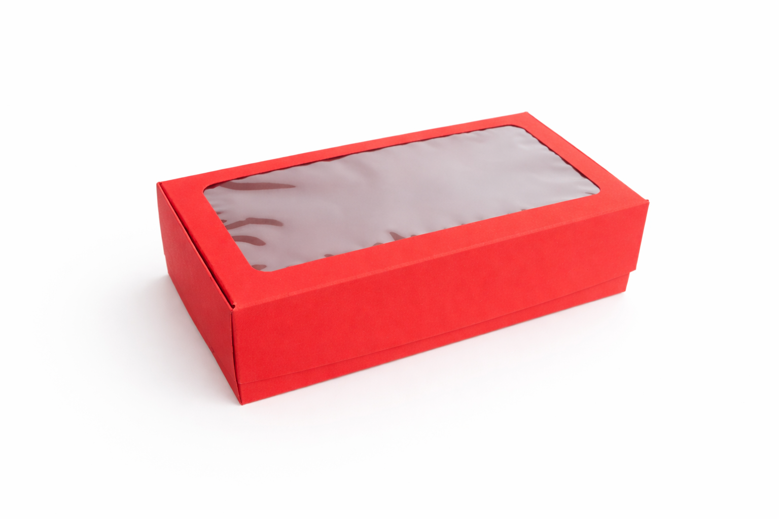 Červená cukrářská krabička s okénkem je ideální pro balení makronek a menších dezertů. Průhledné okénko umožňuje přehlednou prezentaci obsahu bez nutnosti krabičku otevírat.