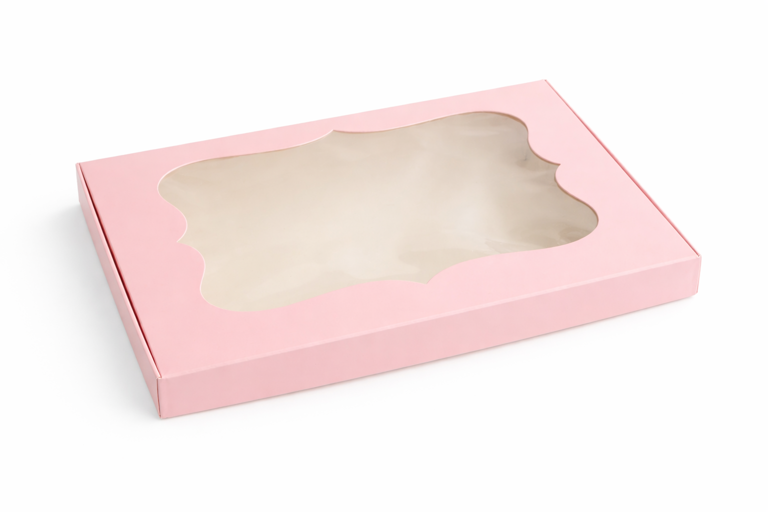 Růžová cukrářská krabička s okénkem je vhodná pro balení perníčků, pralinek a dalších nízkých dezertů. Průhledné okénko umožňuje přehlednou prezentaci obsahu bez otevírání.